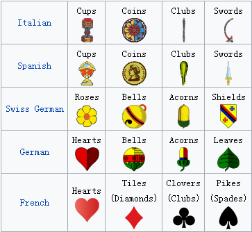14 世纪,纸牌由南欧传入欧洲,欧洲人并不像西亚人善于骑马,他们把「马球棍」改为普通的「棍棒」(Club)。意大利人还在纸牌的基础上发明了「塔罗牌」,最早的塔罗牌分四种花色,是用来玩而不是用来算命的。纸牌的四种花色,由意大利的「杯子、硬币、棍棒、宝剑」一步步演变为法国的「红心、方片、草花、黑桃」。而原本纸牌中「千万、半枝花、全无」3 张特殊牌逐渐演变为「国王、王后、小丑」,并由整副牌 3 张变为每种花色 3 张,最终成为今天扑克牌中的人头牌「K、Q、J」。15 世纪以后,法国的「红心、方片、草花、黑桃」四种花色一副 52 张牌成为欧洲纸牌的统一标准。