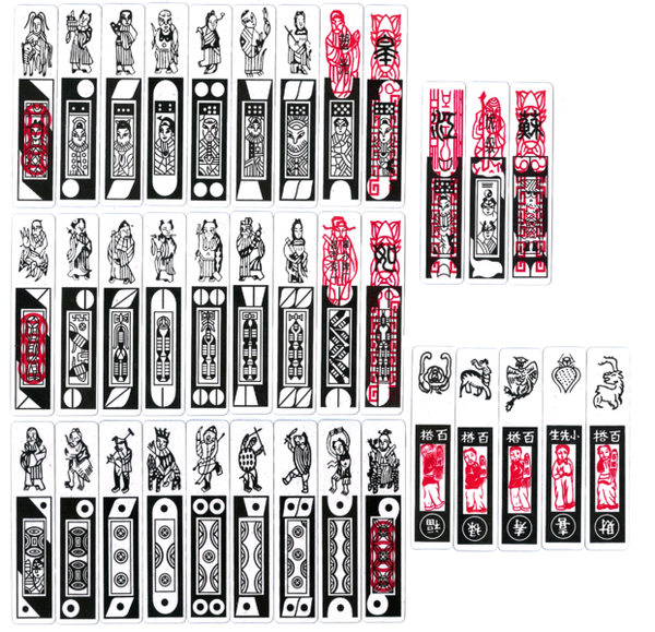 中国传统博戏由一大主流——骰子,和两大支流——纸牌、骨牌汇合而成。商周时期就已经非常盛行的古老游戏「六博」就使用骰子。最古老的纸牌游戏——「叶子」诞生于唐朝。顾名思义,当时人们是在叶子上绘制图案来玩的。叶子于明朝中晚期盛行,材质也变为纸制,后世俗称「马吊」。马吊牌的牌面图案为「钱币的数量」,分为「文钱、索子、万贯、十万」四种花色,索子指的是用绳索穿起来的一串文钱,所以钱币的数量依次增多,其基本玩法也是「以大击小」。