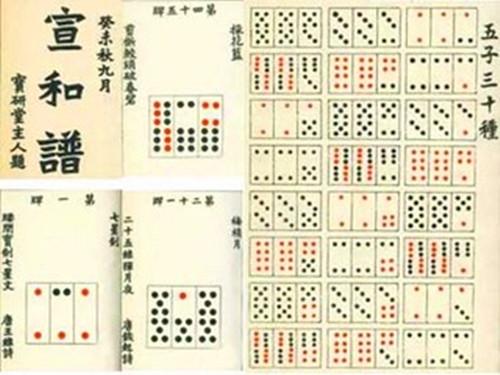 骨牌最早称为「宣和牌」,是在宋朝宣和年间由骰子发明而来,以象牙、兽骨为主要材质,牌面的图案为「两颗骰子的数目」,一副牌有 1-1、1-2、……5-6、6-6 共 21 种组合。宣和牌最早的游戏方式即为「凑牌成和」,类似于今天的麻将。